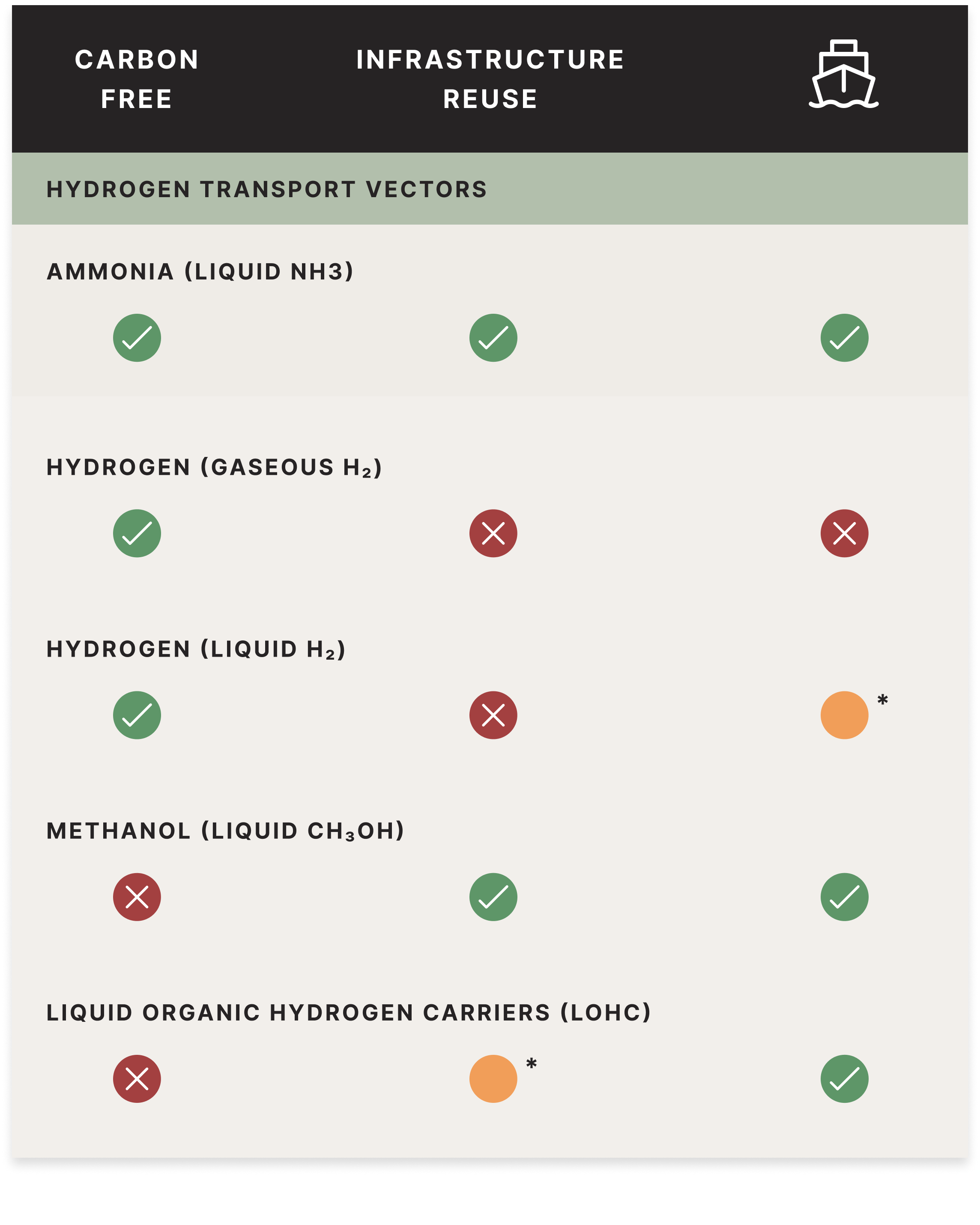 *Ammonia (NH3) is the ideal liquid solution for hydrogen transportation, as it liquifies at a technically feasible and commercially viable temperature (-33°C vs. -253 °C) and is compressed at a lower pressure (7 bar vs. 700 bar) when compared with pure hydrogen (H2).